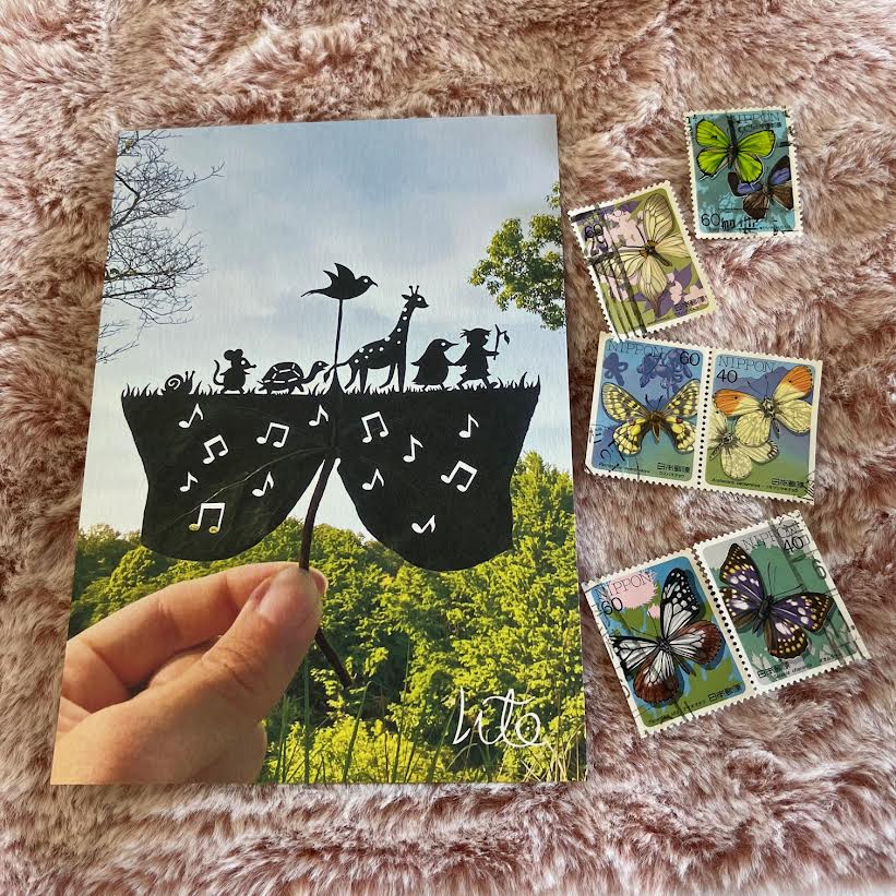 ポスクロの次の送り先は、インドのポスクロをはじめたばかりの女性。切手コレクターで、集めている切手に蝶があったので、手持ちの蝶の使用済み切手の全種を貼っておいた。切手を貼るために大きいサイズのポストカードから選んで、葉っぱの切り絵ににした。会社帰りに投函。